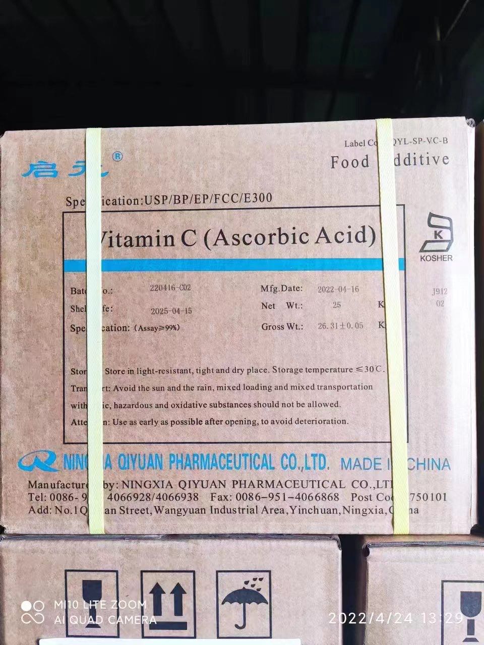 Vitamin C is a white monoclinic crystal or crystalline powder with melting point on 190 ℃ -192 ℃, no smell, sour, yellowish color after long time standing. The product is easily soluble in water, slightly soluble in ethanol, insoluble in ether, chloroform. The aqueous solution is acidic. 5% (W / V) aqueous solution PH2.1-2.6 (W / V), the rotation of aqueous solution is +20.5 ° ~ +21.5°.